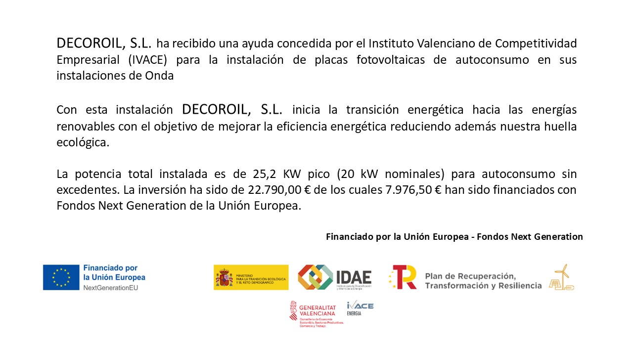 964 328 200Polig. Industrial EL COLOMER Travesía 1ª, Camino Viejo, 15 12200-ONDA, Castellón.info@decoroil.com